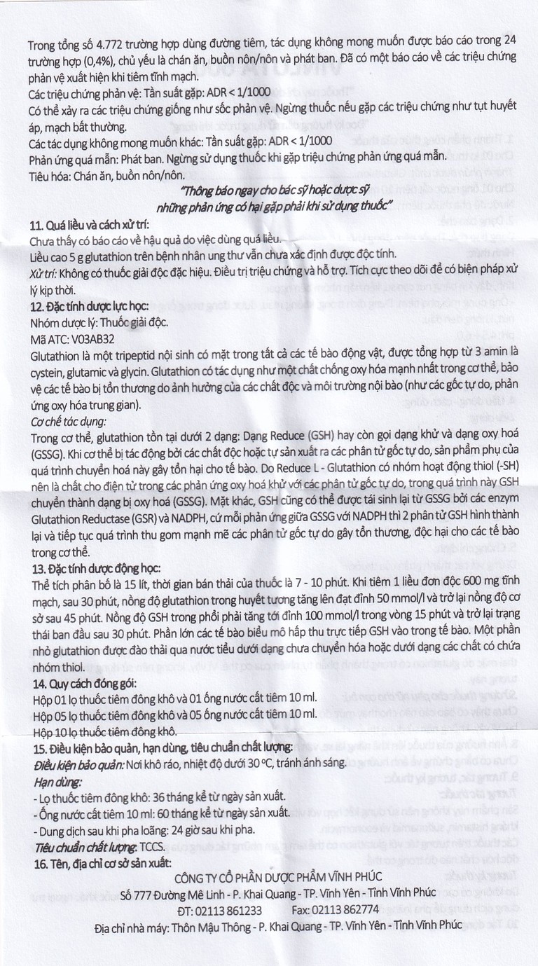 Thể tích phân bố là 15 lít, thời gian bán thải của thuốc là 7 – 10 phút. Khi tiêm 1 liều đơn độc 600 mg tĩnh mạch, sau 30 phút, nồng độ glutathion trong huyết tương tăng lên đạt đỉnh 50 mmol/L và trở lại nồng độ cơ sở sau 45 phút.