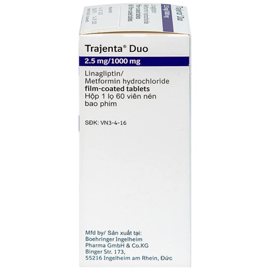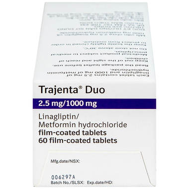Thuốc Trajenta Duo 2.5mg/1000mg là sản phẩm của Boehringer Ingelheim chứa hoạt chất Linagliptin và metformin hydrochloride. Đây là thuốc dùng điều trị bổ sung cho chế độ ăn phù hợp và vận động nhằm cải thiện kiểm soát đường huyết ở những bệnh nhân trưởng thành đái tháo đường type 2