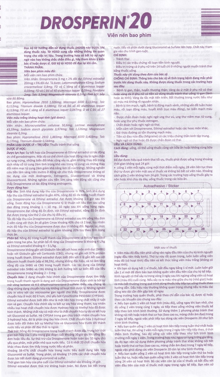 Thuốc Drosperin® 20 được chỉ định dùng trong trường hợp: Tránh thai.