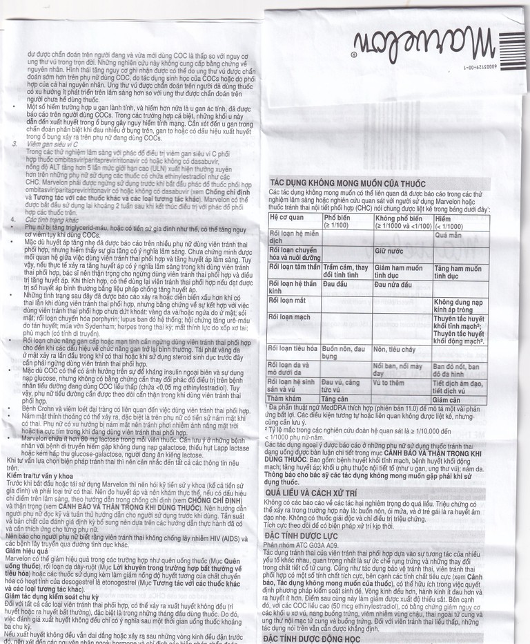 Khi sử dụng thuốc tránh thai Marvelon bạn có thể gặp các tác dụng không mong muốn (ADR):