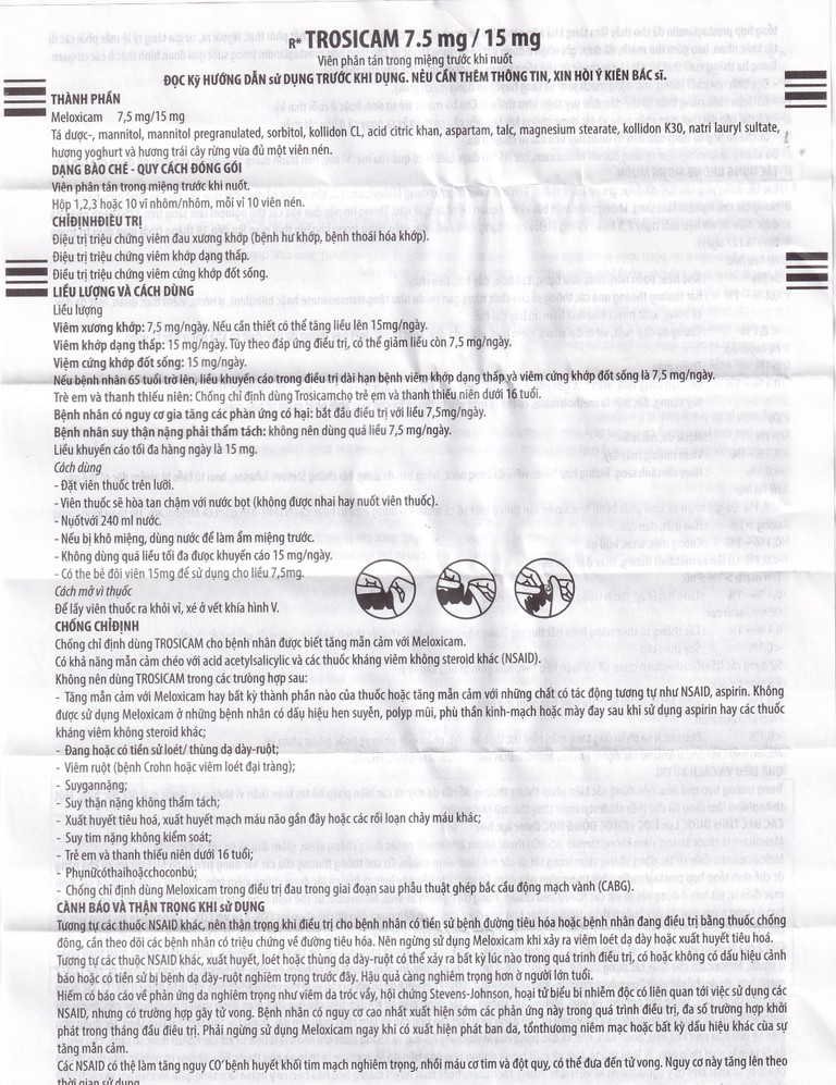 Thuốc Trosicam 7.5 mg dùng đặt viên thuốc trên lưỡi.
