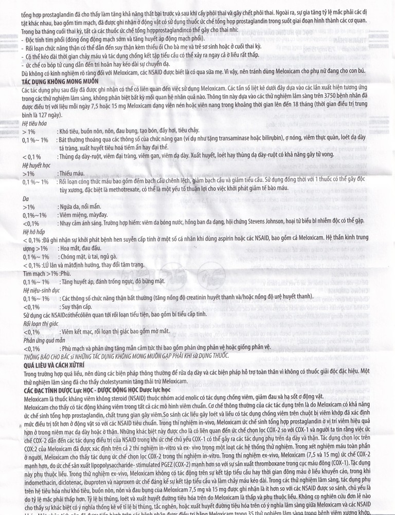 Meloxicam là thuốc kháng viêm không steroid (NSAID) tác dụng giảm đau, hạ sốt, kháng viêm theo cơ chế ức chế sinh tổng hợp prostaglandin, giảm hình thành các chất trung gian gây viêm. Meloxicam ức chế tổng hợp prostaglandin ở vị trí viêm hiệu quả hơn ở niêm mạc dạ dày và thận liên quan đến ức chế chọn lọc COX – 2 hơn COX – 1.