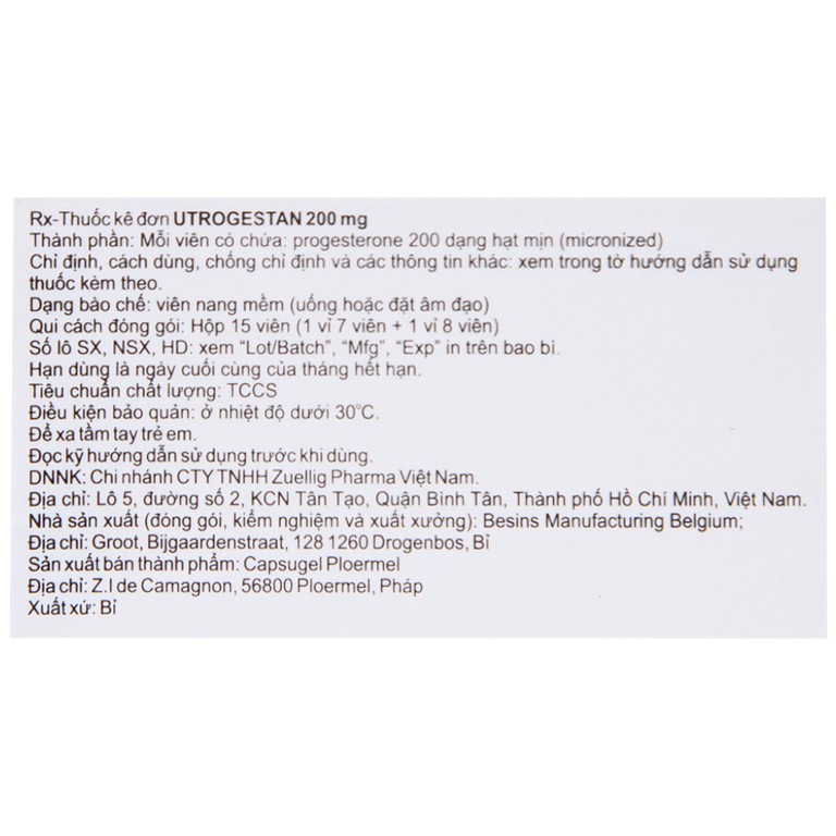 Thuốc Utrogestan 200mg Besins bổ sung nội tiết tố trong bệnh lý sản phụ khoa (15 viên)