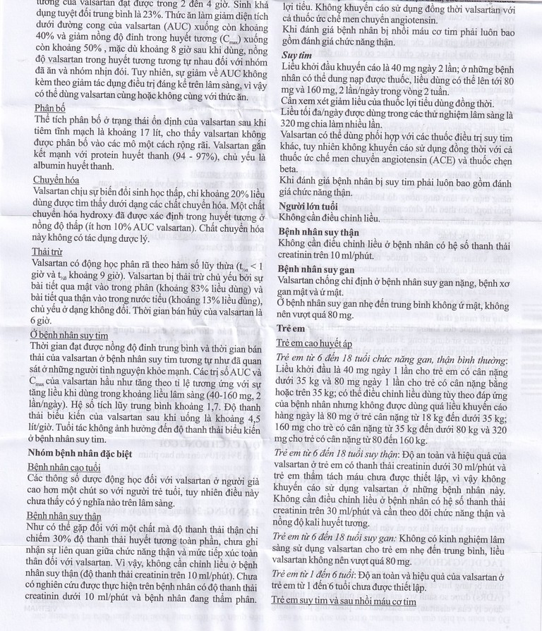 - Các trị số AUC và Cmax của valsartan hầu như tăng theo tỉ lệ tương ứng với sự tăng liều khi dùng trong khoảng liều lâm sàng (40-160 mg, 2 lần/ngày).