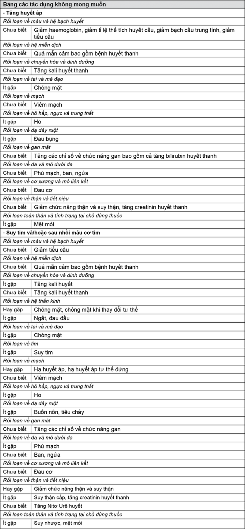 Đối với các phản ứng phụ được báo cáo từ kinh nghiệm hậu mãi và các kết quả cận lâm sàng không thể sắp xếp vào bất cứ tần suất phản ứng phụ nào và do đó chúng được đề cập với tần suất “chưa biết”.