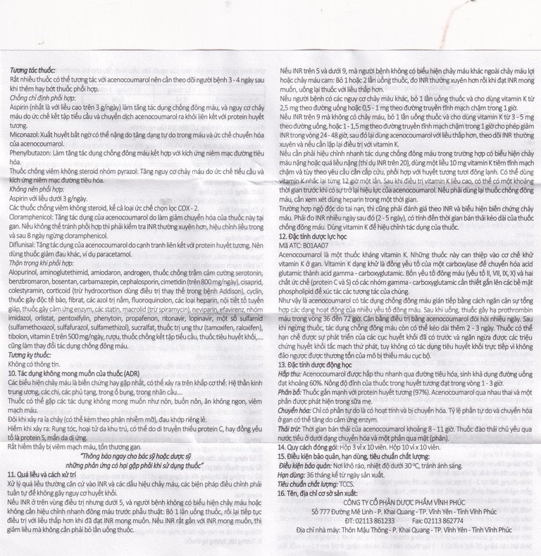 Rất nhiều thuốc có thể tương tác với acenocoumarol nên cần theo dõi người bệnh 3 – 4 ngày sau khi thêm hay bớt thuốc phối hợp.