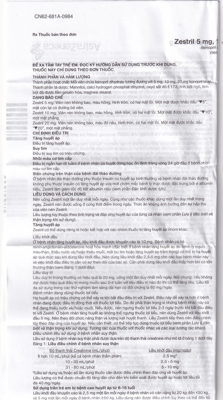Liều khởi đầu (3 ngày đầu tiên sau cơn nhồi máu cơ tim): Dùng Zestril trong vòng 24 giờ từ khi khởi phát triệu chứng. Việc điều trị không nên bắt đầu nếu huyết áp tâm thu thấp hơn 100 mmHg. Liều khởi đầu của Zestril là 5 mg qua đường uống, tiếp theo là 5 mg sau 24 giờ, 10 mg sau 48 giờ và 10 mg một lần/ngày cho các ngày sau đó. Bệnh nhân có huyết áp tâm thu thấp (≤ 120 mmHg) khi khởi đầu điều trị hay trong vòng 3 ngày đầu tiên sau cơn nhồi máu cơ tim nên dùng liều thấp hơn 2,5 mg đường uống.