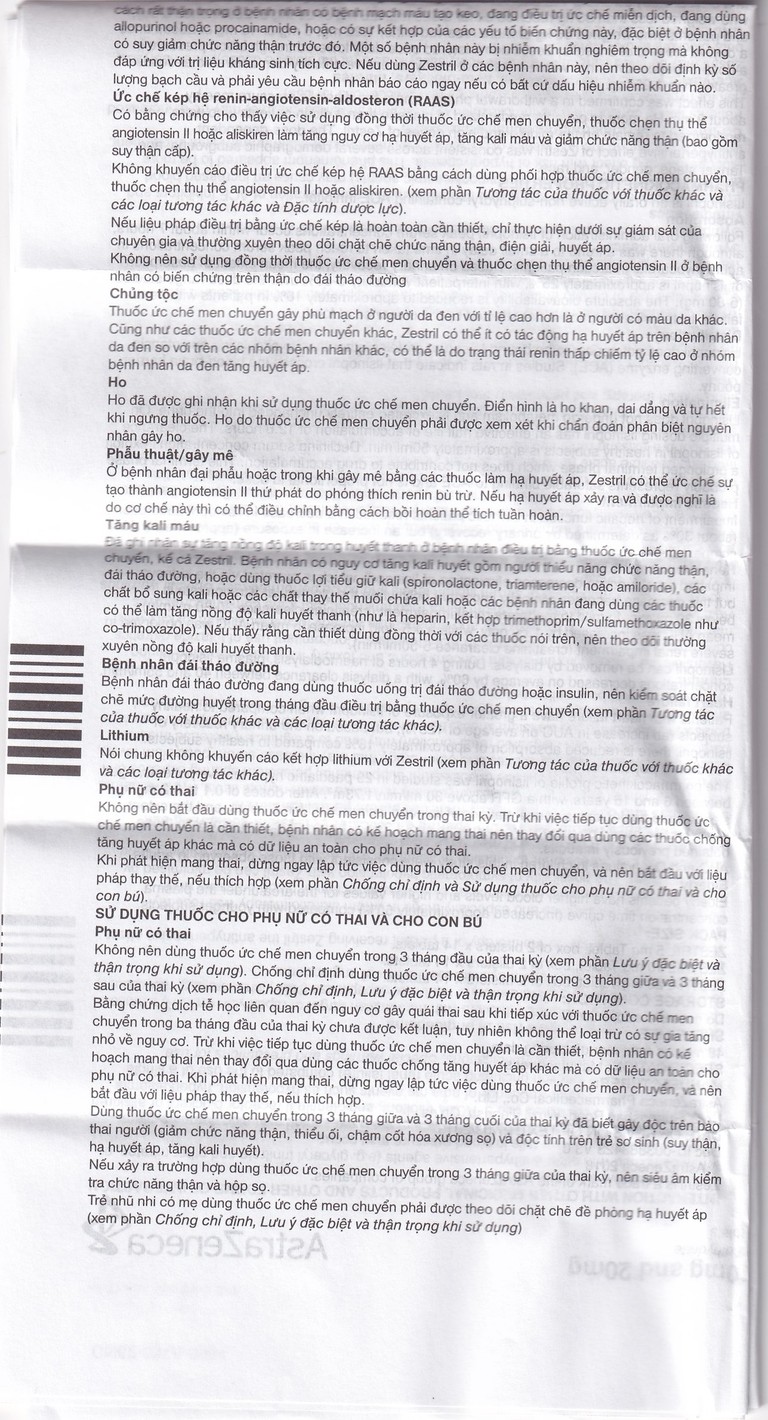 Người ta chưa biết Zestril có được bài tiết qua sữa mẹ hay không. Không nên dùng Zestril ở phụ nữ đang cho con bú.