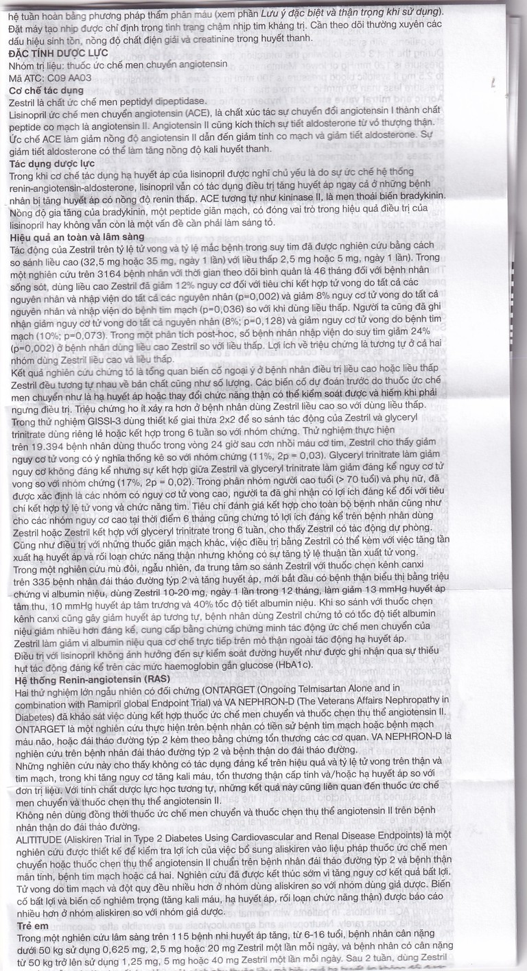 Ở bệnh nhân suy tim có triệu chứng, Zestril được dùng hỗ trợ cho thuốc lợi tiểu, digitalis hoặc thuốc chẹn beta. Liều khởi đầu của Zestril là 2,5 mg x 1 lần/ngày. Nên tăng liều Zestril từng đợt không quá 10 mg, thời gian điều chỉnh không ít hơn 2 tuần và liều tối đa dung nạp lên đến 35 mg x 1 lần/ngày. Việc chỉnh liều dựa trên đáp ứng lâm sàng của bệnh nhân.