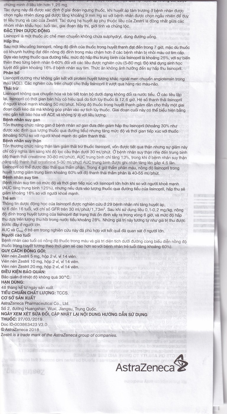 Nên uống Zestril một lần duy nhất mỗi ngày và ở cùng thời điểm trong ngày. Thức ăn không ảnh hưởng đến sự hấp thu của viên nén Zestril.