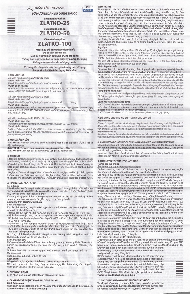 Sinh khả dụng tuyệt đối của sitagliptin khoảng 87%. Do uống thuốc trong bữa ăn có nhiều chất béo không ảnh hưởng đến tác động lên động dược học của Zlatko, nên có thể dùng Zlatko cùng hoặc không cùng với thức ăn (lúc bụng no hoặc lúc bụng đói).