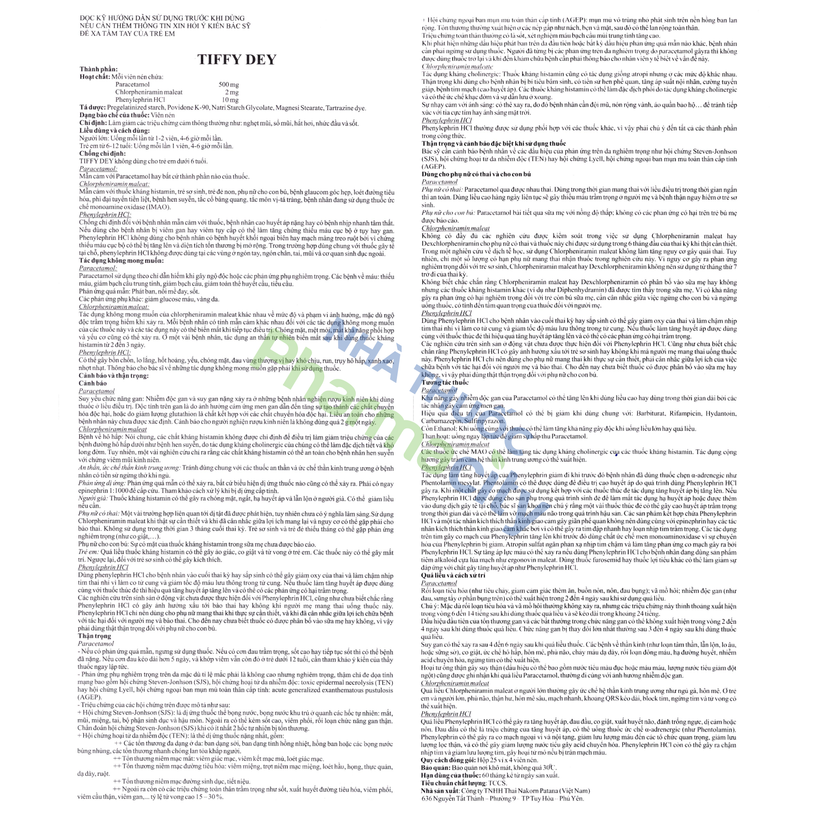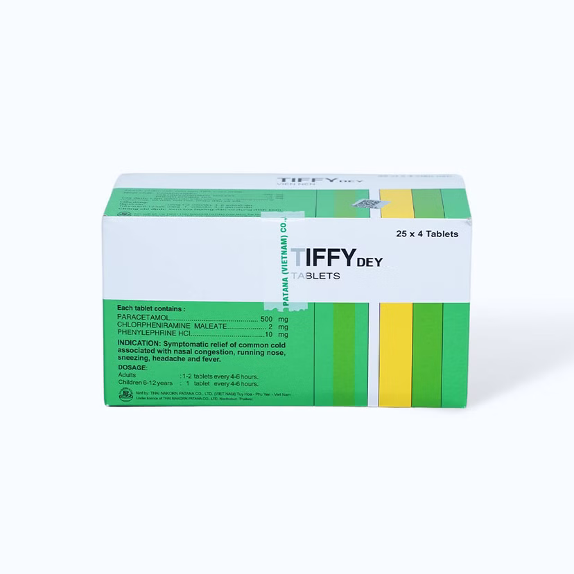 Viên nén Tiffy là sản phẩm của Công ty TNHH Thai Nakorn Patana (Việt Nam), thành phần chính bao gồm paracetamol, chlorpheniramin maleat và phenylephrin HCl. Thuốc được dùng để điều trị các triệu chứng cảm thông thường như: nghẹt mũi, sổ mũi, hắt hơi, nhức đầu và sốt.