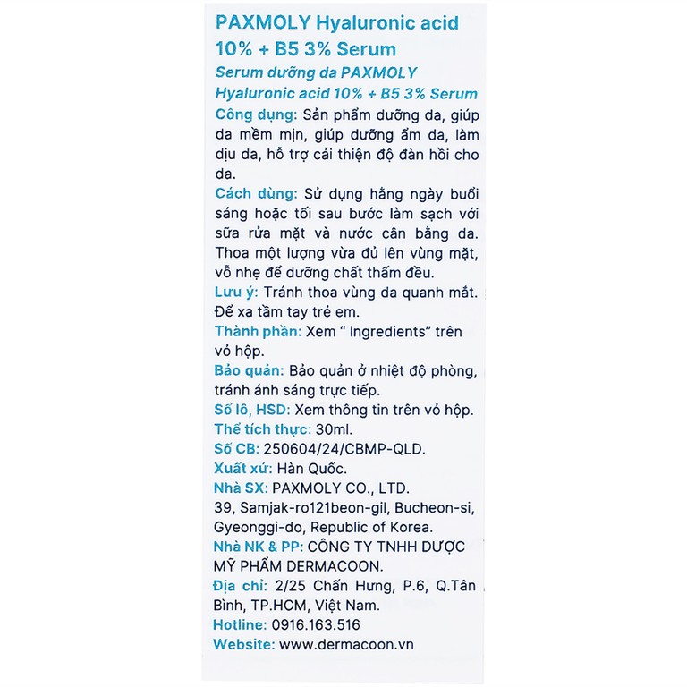 Tinh chất dưỡng da PAXMOLY Hyaluronic Acid 10% + B5 3% Serum (Blue) có công dụng dưỡng da, giúp da mềm mịn, giúp dưỡng ẩm da, làm sáng da.
