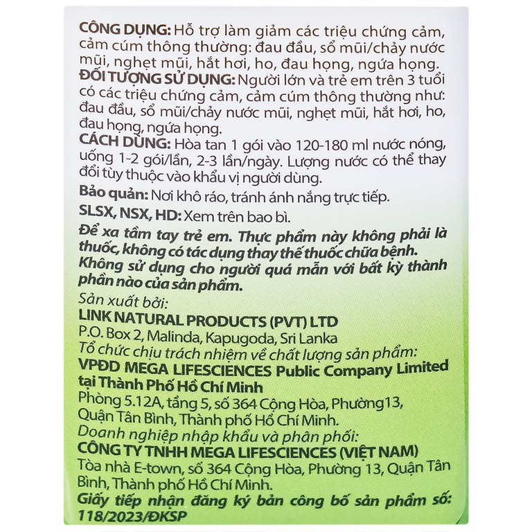 • Hỗ trợ làm giảm 7 triệu chứng cảm, cảm cúm: Tinh chất thảo dược từ 14 loại tự nhiên, hỗ trợ làm giảm khó chịu do cảm, cảm cúm với các triệu chứng thường gặp như ho, đau họng, sổ mũi, hắt hơi, nghẹt mũi, đau đầu và ngứa họng.