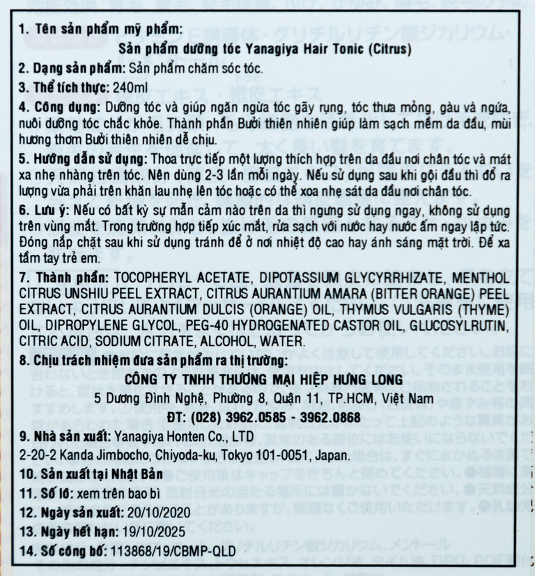 Thành phần của Tinh dầu bưởi Yanagiya Hair Tonic