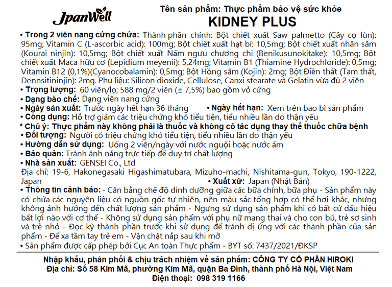 Viên bổ thận Kidney Plus Jpanwell hỗ trợ bổ thận, duy trì đường tiết niệu khỏe mạnh (60 viên)