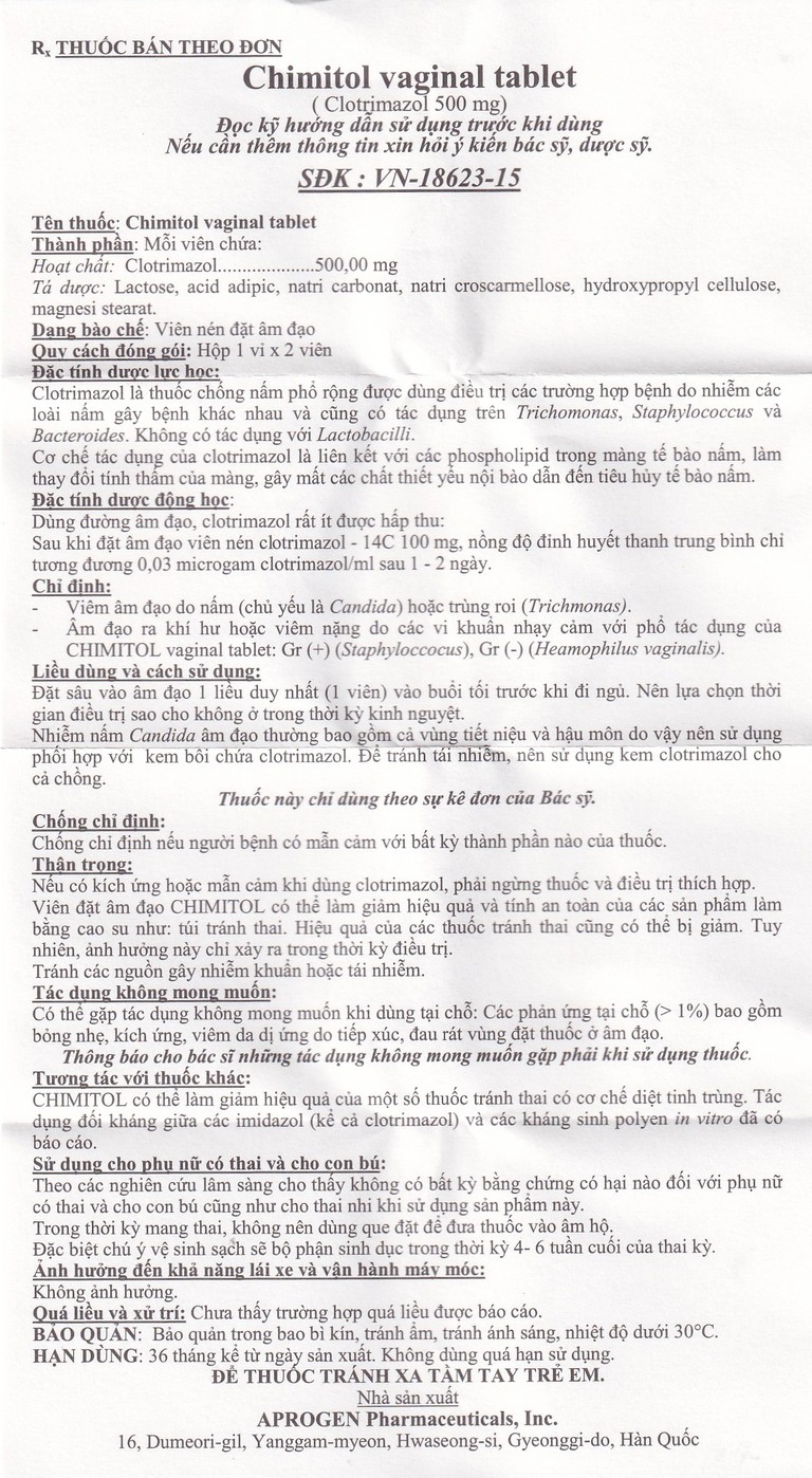 Viên đặt âm đạo Chimitol Vaginal Tab Aprogen điều trị viêm âm đạo do nấm (1 vỉ x 2 viên)