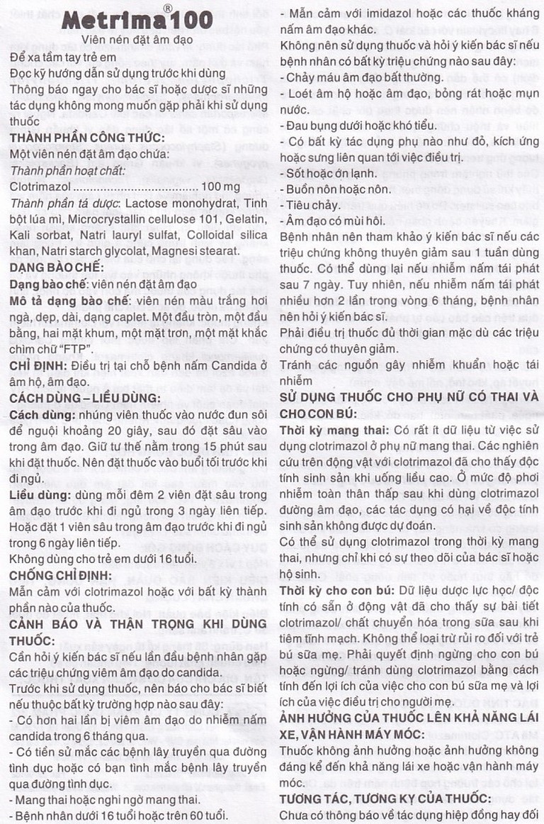 Thuốc Metrima®100 được chỉ định dùng trong điều trị tại chỗ bệnh nấm Candida ở âm hộ, âm đạo.