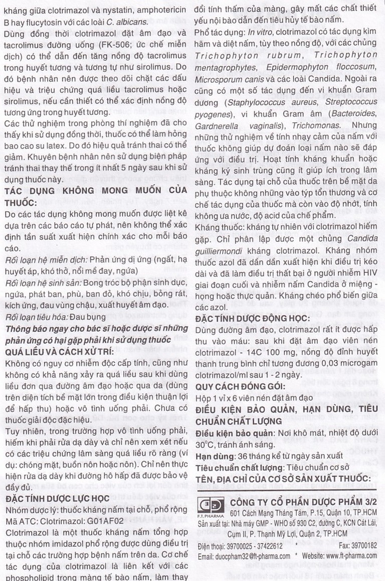 Dùng đường âm đạo, clotrimazol rất ít được hấp thu vào máu: Sau khi đặt âm đạo viên nén clotrimazol – 14C 100 mg, nồng độ đỉnh huyết thanh trung bình chỉ tương đương 0,03 microgam clotrimazol/ml sau 1 – 2 ngày.