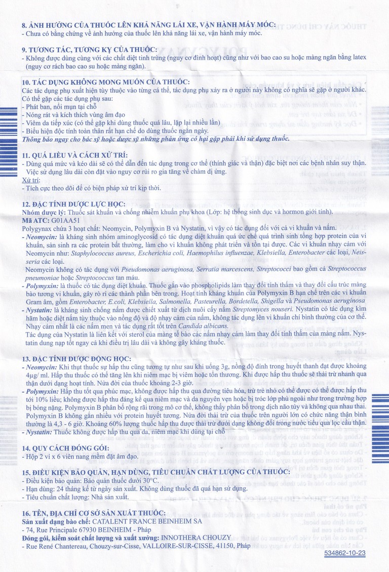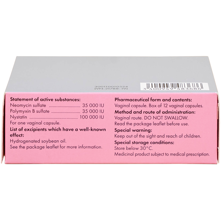 Do chưa có số liệu về khả năng hấp thu neomycin và polymicin B của niêm mạc âm đạo, nên nguy cơ ảnh hưởng toàn thân, đặc biệt trong trường hợp suy giảm chức năng gan, thận và bị bệnh tiểu đường là không thể loại trừ 1g màng ngăn âm đạo hoặc bao cao su, do nguy cơ bị vỡ, rách do thuốc.