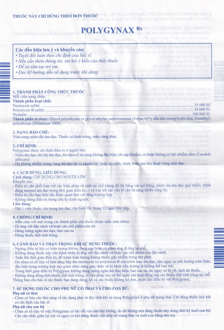 Chưa có số liệu về việc Polygynax có bài tiết vào sữa hay không, do đó không nên dùng thuốc này trong thời kỳ cho con bú. Cần cân nhắc giữa lợi ích và nguy cơ khi dùng thuốc cho phụ nữ nuôi con bằng sữa mẹ.