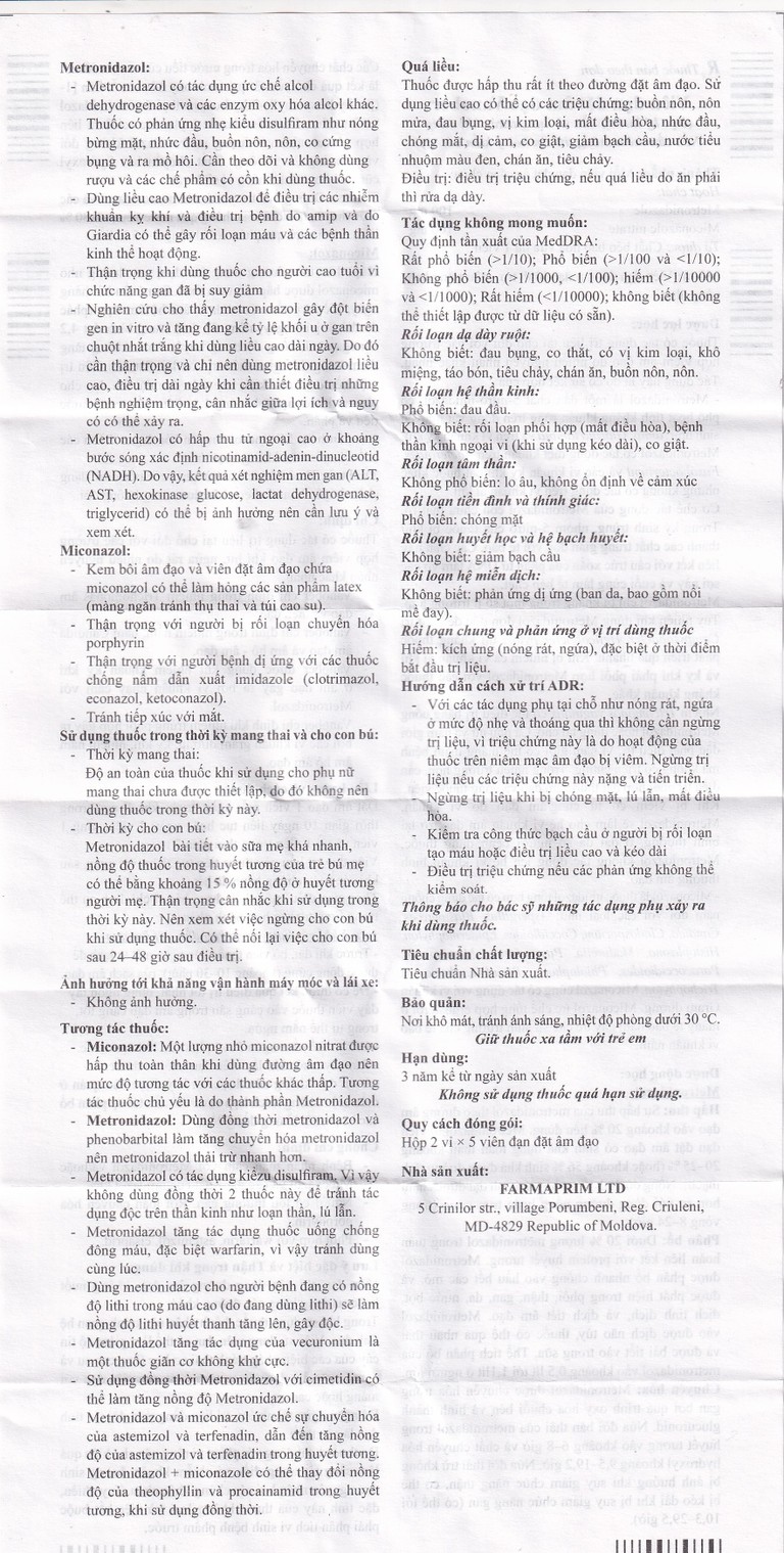 - Miconazol: Một lượng nhỏ miconazol nitrat được hấp thu toàn thân khi dùng đường âm đạo nên mức độ tương tác với các thuốc khác thấp. Tương tác thuốc chủ yếu do thành phần Metronidazol.