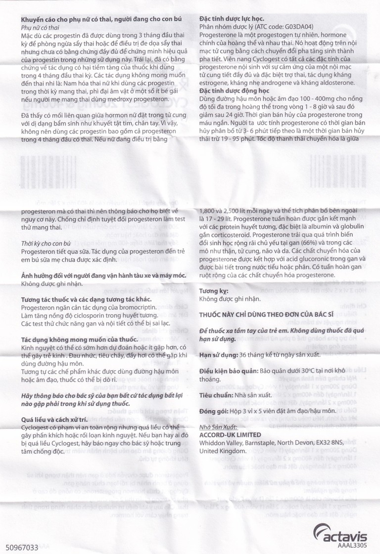 Cyclogest 400 3×5 chứa hormone progesterone, có nồng độ cao ở phụ nữ trong phần thứ 2 của chu kỳ kinh và trong lúc mang thai. Cần lưu ý khi điều trị những bệnh nhân đang trong tình trạng nhạy cảm với hormon.