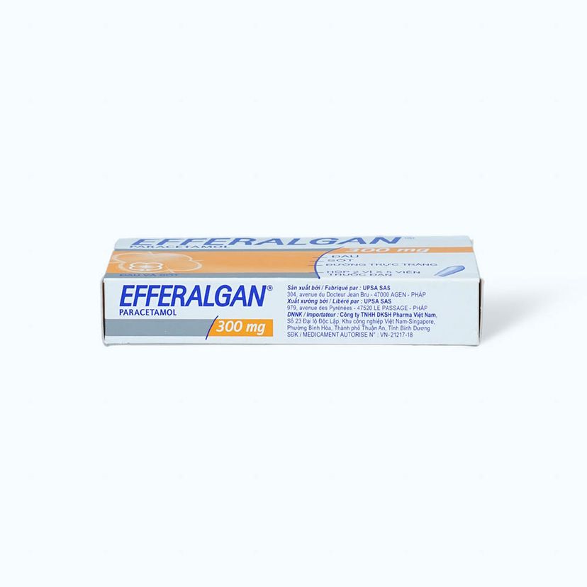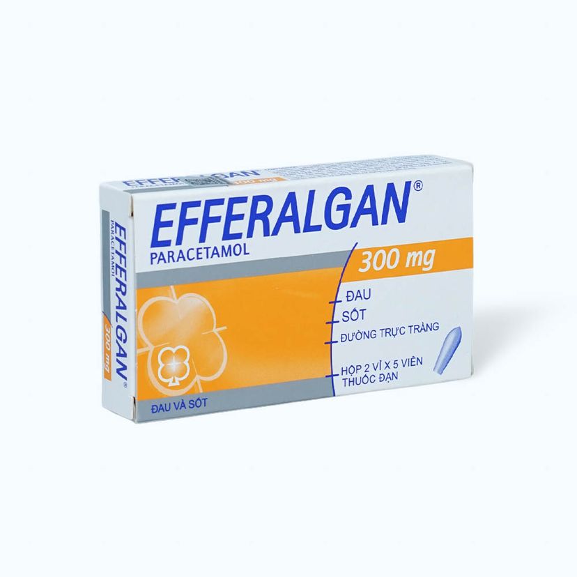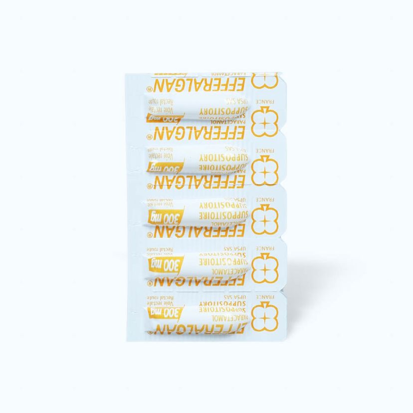 Viên đặt trực tràng hạ sốt Efferalgan 300mg của Công ty Bristol – Myers Squibb, thành phần chính là Paracetamol. Efferalgan 300 mg là thuốc điều trị các chứng đau và/hoặc sốt như đau đầu, tình trạng như cúm, đau răng, nhức mỏi cơ.