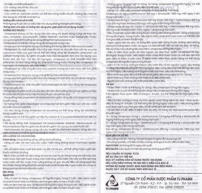 Trên 40 kg: Omeprazol 20 mg + clarithromycin 500 mg + amoxycilin 1000 mg: mỗi ngày 2 lần trong một tuần.