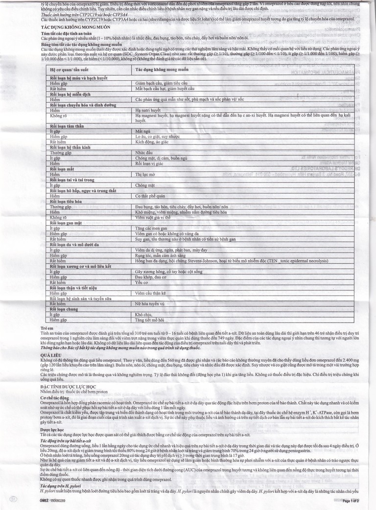 Omeprazol được dung nạp tốt. Các tác dụng không mong muốn xảy ra ≥ 1% không đánh giá được mối quan hệ nhân quả có thể là: Đau bụng (5.2%), suy nhược (1.3%), táo bón (1.5%), ỉa chảy (3.7%), đầy hơi (2.7%), buồn nôn (4.0%), nôn (1.9%), ợ chua (1.9%), đau đầu (2.9%).
