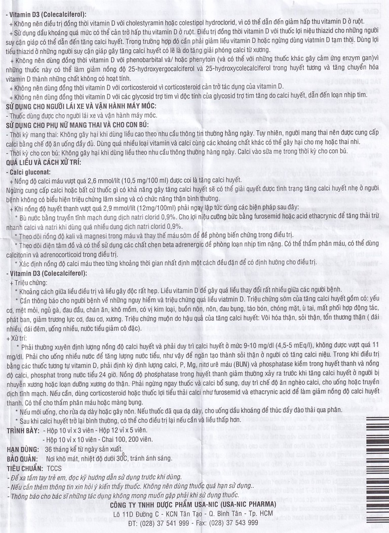 Cần thông báo cho người bệnh về những nguy hiểm và triệu chứng quá liều viatmin D. Triệu chứng sớm của tăng calci huyết gồm có: Yếu cơ, mệt mỏi, ngủ gà, đau đầu, chán ăn, khô mồm, có vị kim loại, buồn nôn, nôn, đau bụng, táo bón, chóng mặt, ù tai, mất phối hợp động tác, phát ban, giảm trương lực cơ, đau cơ, xương. Triệu chứng muộn do hậu quả của tăng calci huyết: Vôi hóa thận, sỏi thận, tổn thương thận ( đái nhiều, đái đêm, uống nhiều, nước tiểu giảm cô đặc).