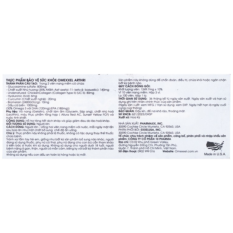Omexxel Arthri Plus Omega 3 được sản xuất và nhập khẩu hoàn toàn từ Mỹ, dây chuyền sản xuất của nhà máy được công nhận bởi FDA – cơ quan quản lý thực phẩm và dược phẩm hàng đầu tại Mỹ và được Bộ Y Tế Việt Nam cấp phép.