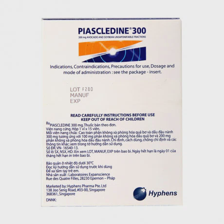 Piascledine 300mg của Công ty Laboratoires Expanscience có thành phần chính là cao toàn phần không xà phòng hoá quả bơ và đậu nành. Thuốc có tác dụng điều trị triệu chứng trong viêm xương khớp hông và khớp gối, điều trị hỗ trợ viêm nha chu.