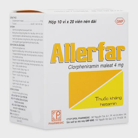 Viên nén Allerfar 4mg điều trị triệu chứng viêm mũi dị ứng, mày đay (10 vỉ x 20 viên)Viên nén Allerfar 4mg điều trị triệu chứng viêm mũi dị ứng, mày đay (10 vỉ x 20 viên)