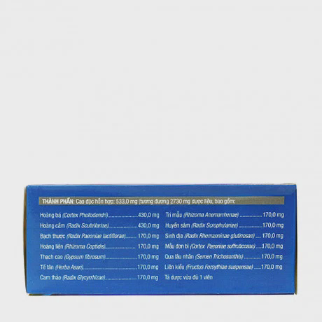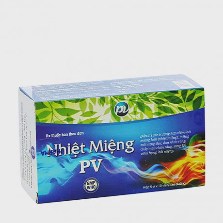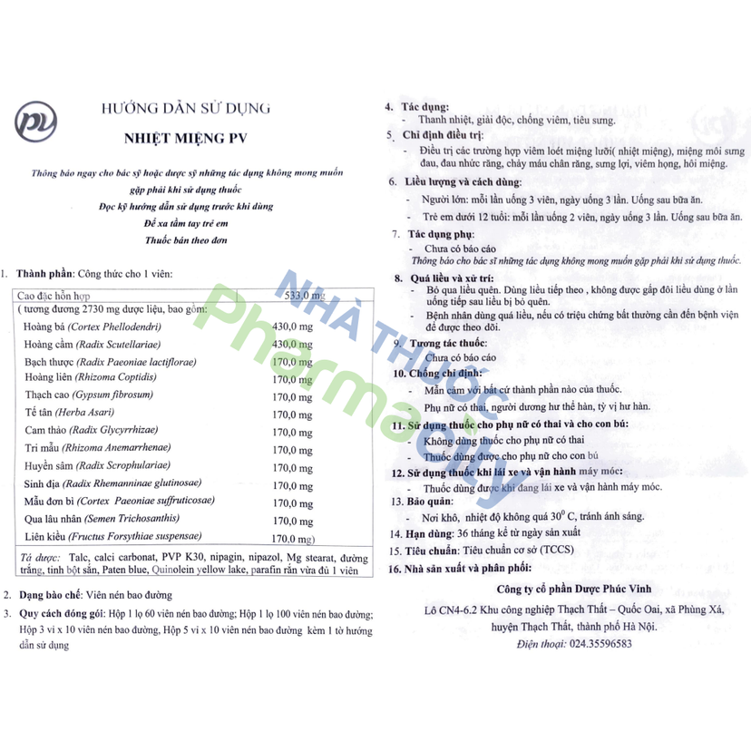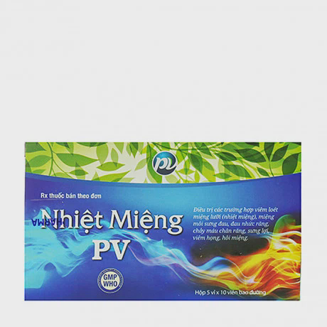 - Viên nén bao đường Nhiệt miệng PV 533mg của Công ty cổ phần Dược Phúc Vinh có thành phần chính gồm hoàng bá, hoàng cầm, bạch thược, hoàng liên, thạch cao, tế tân, cam thảo, tri mẫu, huyền sâm, sinh địa, mẫu đơn bì, qua lâu nhân, liên kiều.