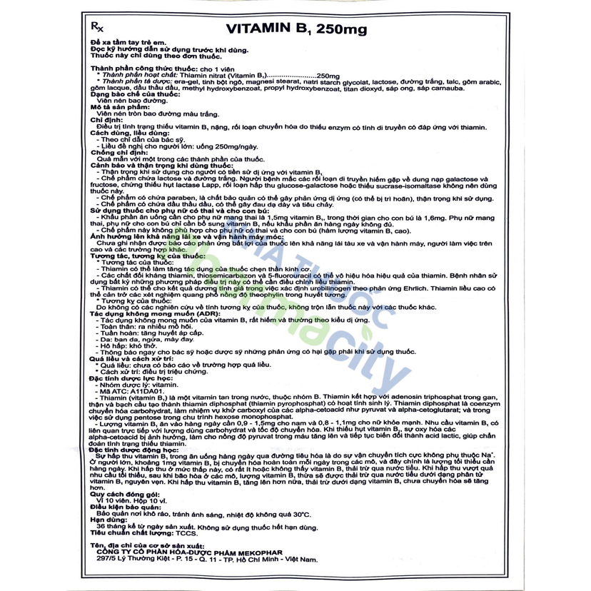 Viên nén bao đường Vitamin B1 250mg điều trị bệnh do thiếu vitamin B1 (10 vỉ x 10 Viên)