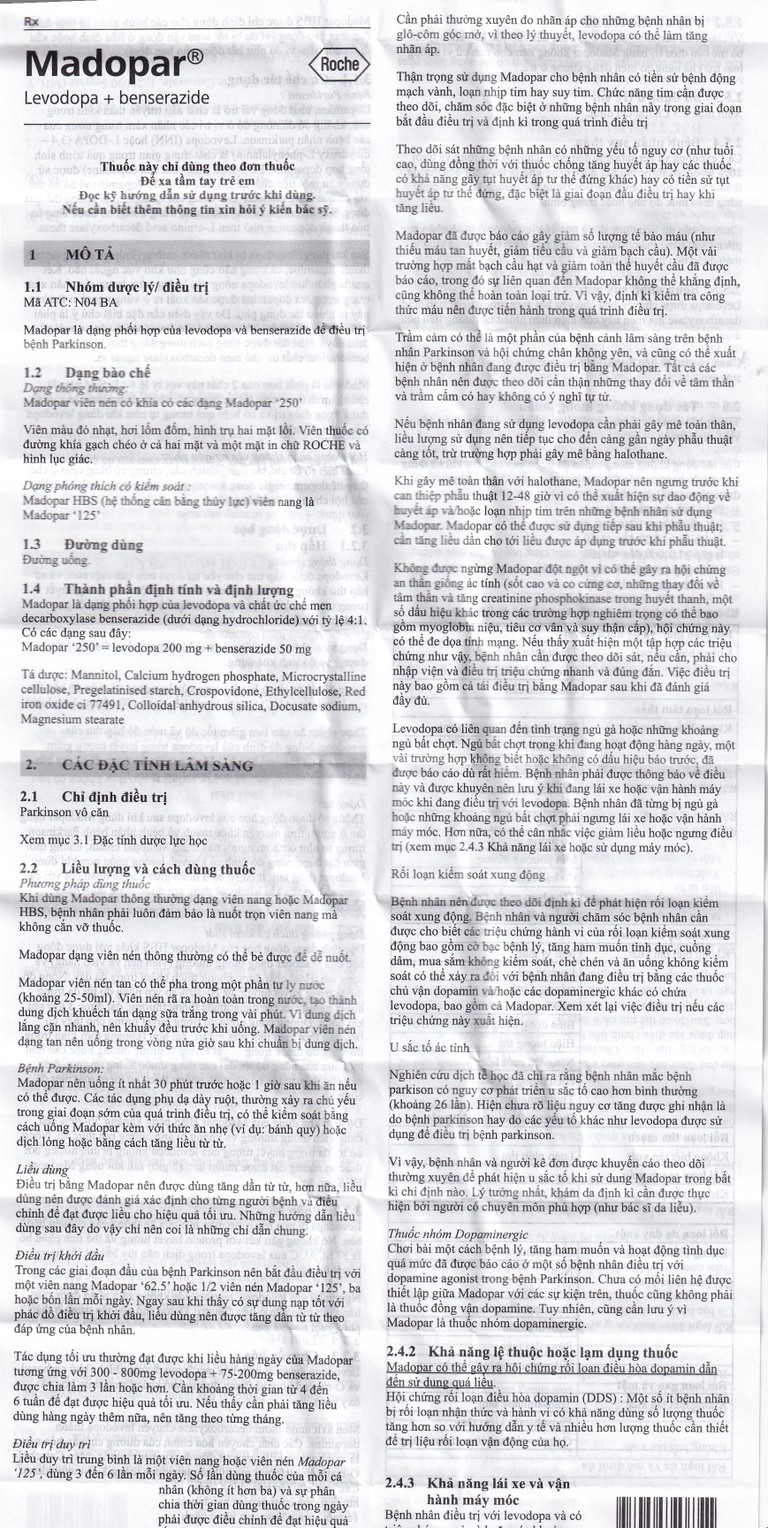 Cách dùng Viên nén Madopar Levodopa And Benserazide 250