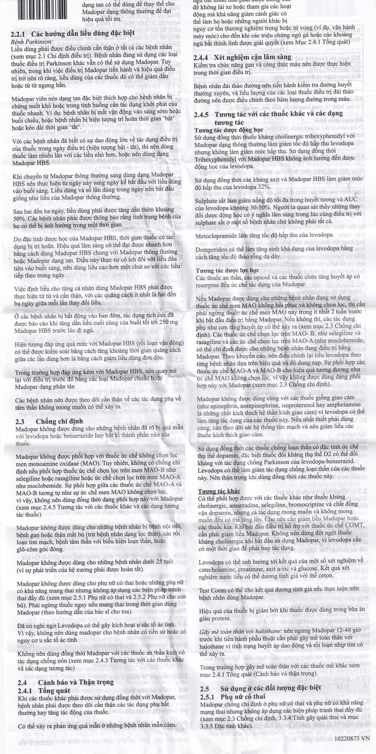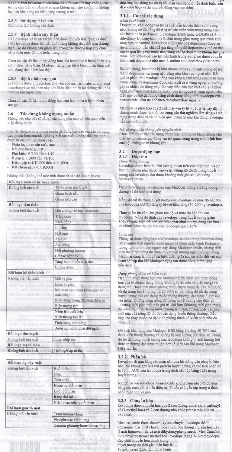 Khi dùng Madopar thông thường dạng viên nang hoặc Madopar HBS, bệnh nhân phải luôn đảm bảo là nuốt trọn viên nang mà không cần vỏ thuốc.