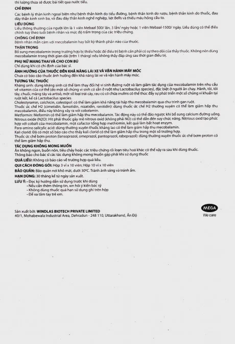 Mebaal 1500 Mega 3 x 10 của công ty Windlas Biotech Ltd. sản xuất, do công ty Mega Lifesciences Public Company Limited đăng ký phân phối. Đây là thuốc dùng để điều trị các bệnh lý thần kinh ngoại biên như bệnh thần kinh do tiểu đường, bệnh thần kinh do rượu, bệnh thần kinh do thuốc, đau dây thần kinh sinh ba và đau dây thần kinh nghề nghiệp, liệt Bells và thiếu máu hồng cầu to.
