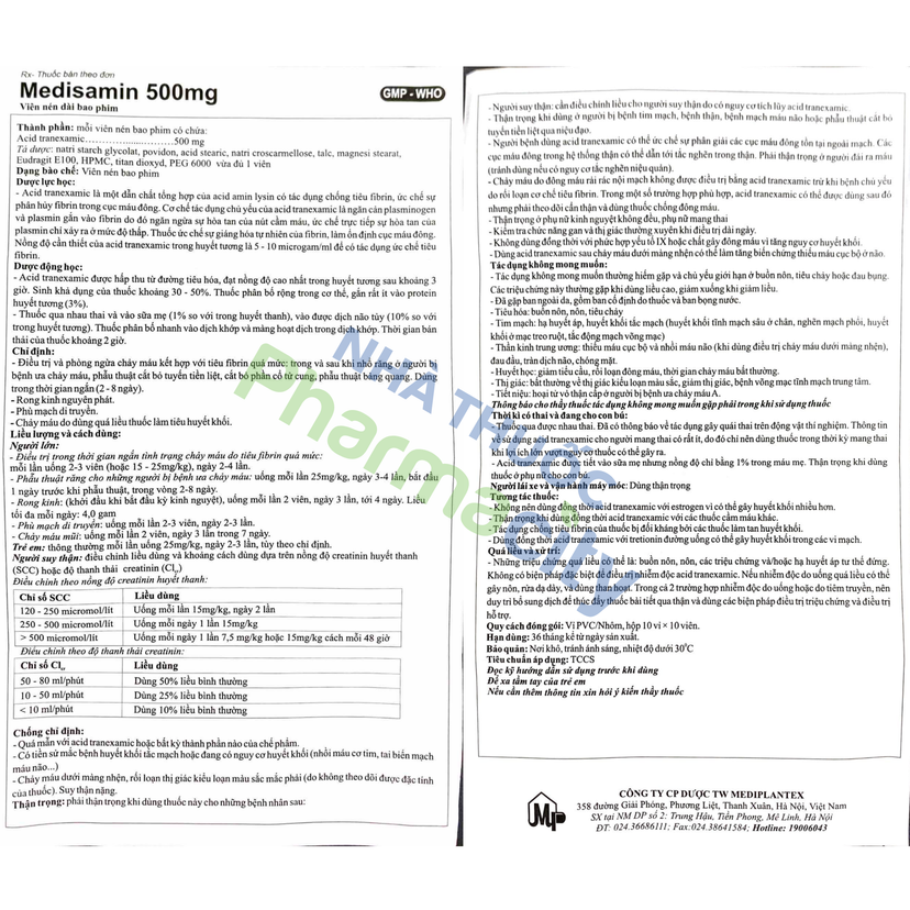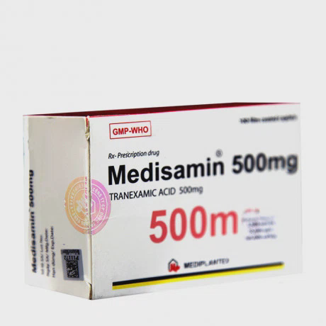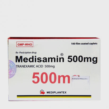 Thuốc Medisamin 500mg là sản phẩm của Công ty Cổ phần Dược Trung ương Mediplantex, với thành phần chính là acid tranexamic. Đây là thuốc được dùng để điều trị và phòng ngừa chảy máu kết hợp với tăng phân hủy fibrin. Dùng thời gian ngắn để phòng và điều trị ở người bệnh có nguy cơ cao chảy máu trong và sau khi phẫu thuật (cắt bỏ tuyến tiền liệt, cắt bỏ phần cổ tử cung, nhổ răng ở người hemophili, đái ra máu, rong kinh, chống máu cam…).