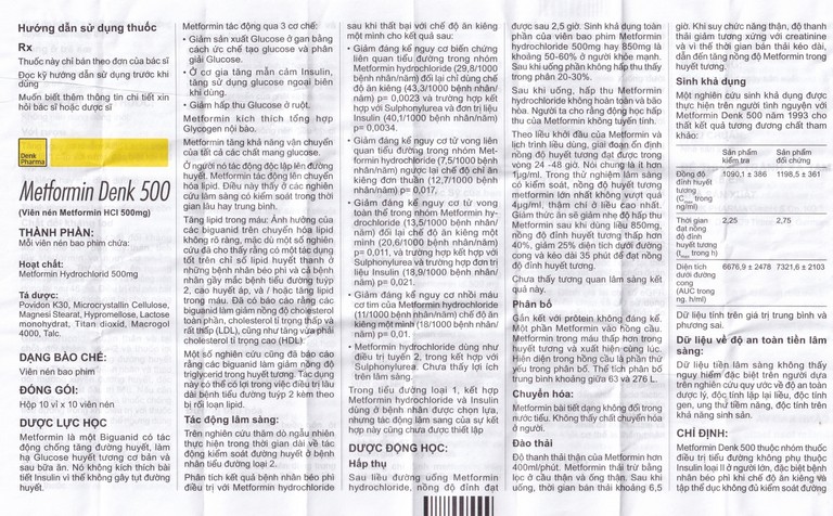 Metformin Denk 500 thuộc nhóm thuốc điều trị đái tháo đường không phụ thuộc Insulin loại II ở người lớn, đặc biệt bệnh nhân béo phì khi chế độ ăn kiêng và tập thể dục không đủ kiểm soát đường huyết. Metformin Denk 500 dùng đơn trị liệu hay kết hợp với tác nhân chống đái tháo đường đường uống hay với insulin.