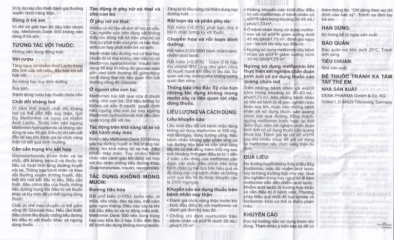 Rối loạn dạ dày ruột: Các triệu chứng dạ dày ruột như buồn nôn, nôn, tiêu chảy, đau dạ dày, không ngon miệng. Các triệu chứng này thường xảy ra khi bắt đầu điều trị và thường tự nhiên mất đi. Metformin Denk 500 cần dùng vào cùng hay sau bữa ăn trong 2 hoặc 3 liều đơn để tránh những hiện tượng này. Sự tăng liều chậm cũng có thể cải thiện sự dung nạp của dạ dày ruột.