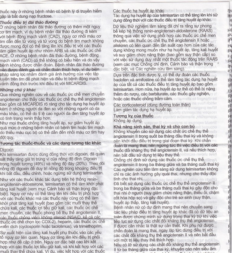 Bệnh nhân đái tháo đường nên được đánh giá và chẩn đoán thích hợp, ví dụ biện pháp sàng lọc nhằm đánh giá ảnh hưởng của việc tập luyện trên tim để phát hiện và điều trị bệnh động mạch vành đồng thời trước khi dùng Micardis 40mg.