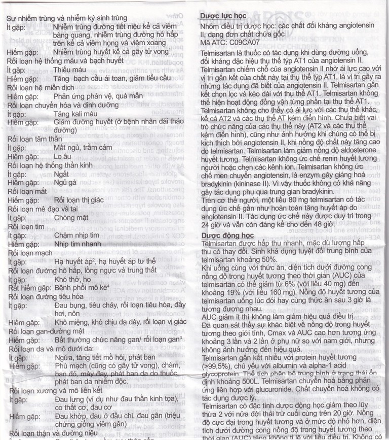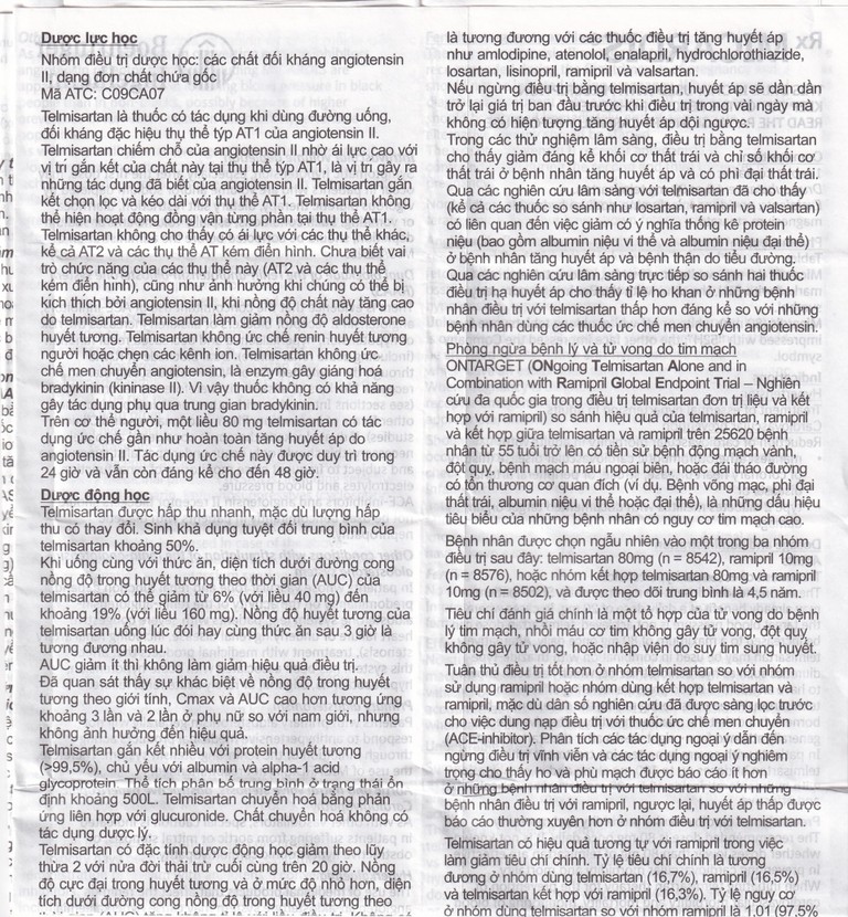 Trong một nghiên cứu dùng kết hợp telmisartan với ramipril dẫn tới tăng 2,5 lần AUC0-24 và Cmax của ramipril và ramiprilate. Chưa biết được liên quan lâm sàng của quan sát này.