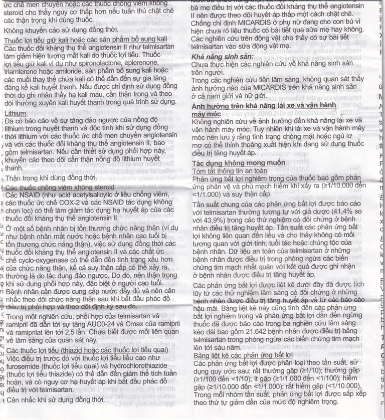 Sự gia tăng nồng độ lithium huyết thanh và độc tính có thể hồi phục được đã được ghi nhận khi dùng chung lithium với các chất ức chế men chuyển angiotensin. Một số trường hợp cũng đã được báo cáo khi dùng chung với chất đối kháng thụ thể angiotensin II kể cả Micardis. Do đó, nên theo dõi nồng độ lithium trong huyết thanh khi dùng chung hai thuốc.