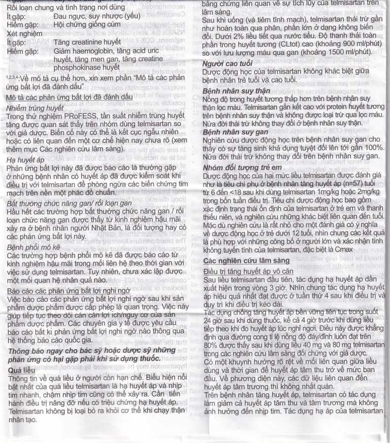 Thông tin về quá liều ở người còn hạn chế. Biểu hiện nổi bật nhất của quá liều telmisartan là hạ huyết áp và nhịp tim nhanh, chậm nhịp tim cũng có thể xảy ra.