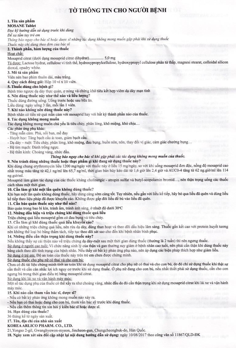 Viên nén Mosane Tablet 5mg Arlico điều trị bệnh trào ngược dạ dày – thực quản, ợ nóng (10 vỉ x 10 viên)