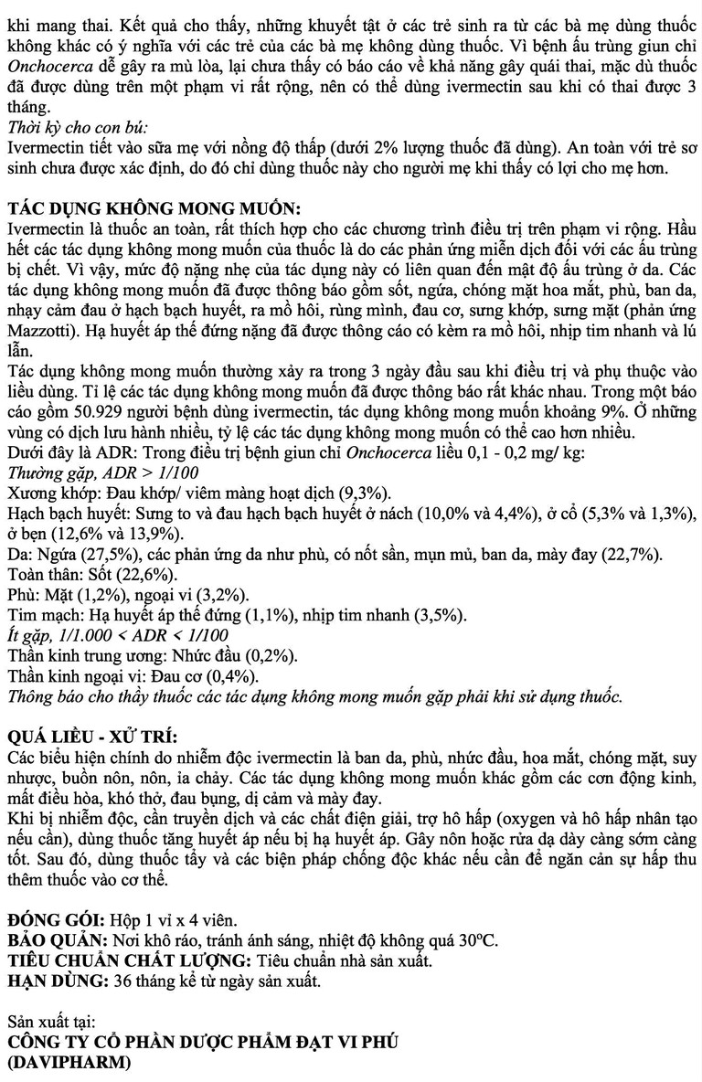 Tác dụng không mong muốn thường xảy ra trong 3 ngày đầu sau khi điều trị và phụ thuộc vào liều dùng. Tỉ lệ các tác dụng không mong muốn đã được thông báo rất khác nhau. Trong một báo cáo gồm 50.929 người bệnh dùng ivermectin, tác dụng không mong muốn khoảng 9%. Ở những vùng có dịch lưu hành nhiều, tỷ lệ các tác dụng không mong muốn có thể cao hơn nhiều.