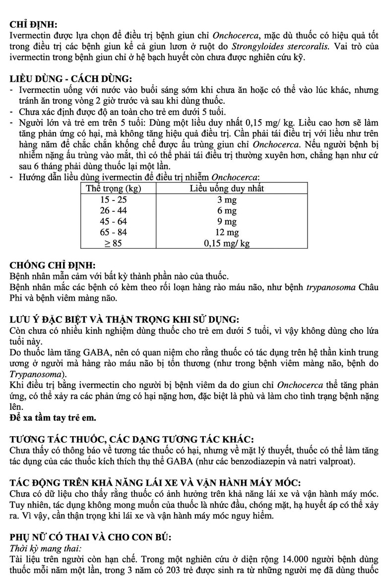 Người lớn và trẻ em trên 5 tuổi: Dùng một liều duy nhất 0,15 mg/ kg. Liều cao hơn sẽ làm tăng phản ứng có hại, mà không tăng hiệu quả điều trị. Cần phải tái điều trị với liều như trên hàng năm để chắc chắn khống chế được ấu trùng giun chỉ Onchocerca. Nếu người bệnh bị nhiễm nặng ấu trùng vào mắt, thì có thể phải tái điều trị thường xuyên hơn, chẳng hạn như cứ sau 6 tháng phải dùng thuốc lại một lần.
