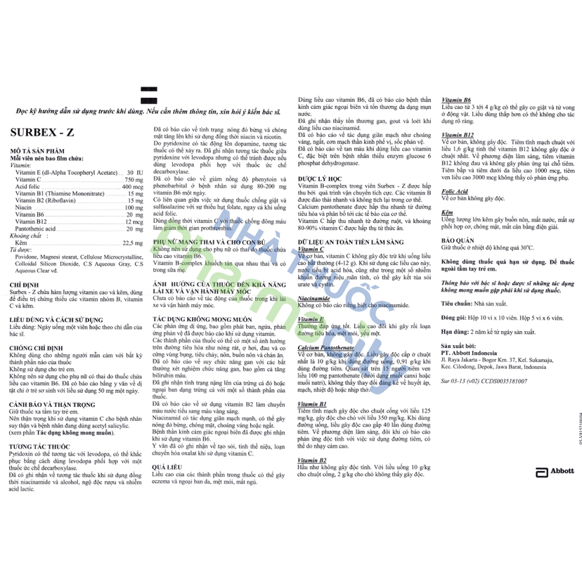 Viên nén Surbex Z là một loại thuốc của Abbot, thuốc được chỉ định sử dụng trong trường hợp người bệnh thiếu vi chất kẽm, các vitamin B và C. Thuốc được sử dụng bằng đường uống khi điều trị.